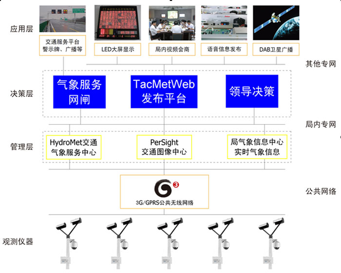交通環(huán)境監(jiān)測系統(tǒng),主要實(shí)現(xiàn)雨、雪、霧(能見度)等綜合天氣現(xiàn)象的實(shí)況監(jiān)測預(yù)警和現(xiàn)場實(shí)時(shí)視頻圖像的獲得。包括雨、雪、霧等所有天氣現(xiàn)象的代碼,降水過程的滴譜;觀測低能見度范圍的精確數(shù)據(jù)(主要在5千米以內(nèi)),預(yù)警影響交通的能見度精確數(shù)據(jù)(500米內(nèi)),解決影響交通安全關(guān)鍵的氣象因素的實(shí)況監(jiān)測與預(yù)警問題。建立公路氣象觀測模型,天氣狀態(tài)監(jiān)測和實(shí)景監(jiān)控相結(jié)合,給決策者提供第一手的真實(shí)數(shù)據(jù),給出相應(yīng)的預(yù)警發(fā)布信息,達(dá)到公路氣象服務(wù)的目的。