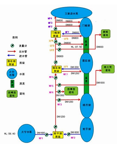 永定河循環管線(門城湖 ~ 宛平湖)工程范圍為永定河門城湖、蓮石湖、曉月湖、宛平湖的水質循環系統,在永定河右岸建設的3座泵站通過鋪設的循環管線向濕地及河道上游供水,形成水流循環的“ 生態補水型 ” 治理模式,通過優化調度水資源,增加河道蓄水,形成溪流連通的湖泊和濕地。